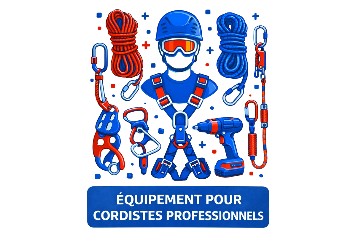 Secours en hauteur : cordes, harnais, treuils, tapis de protection.